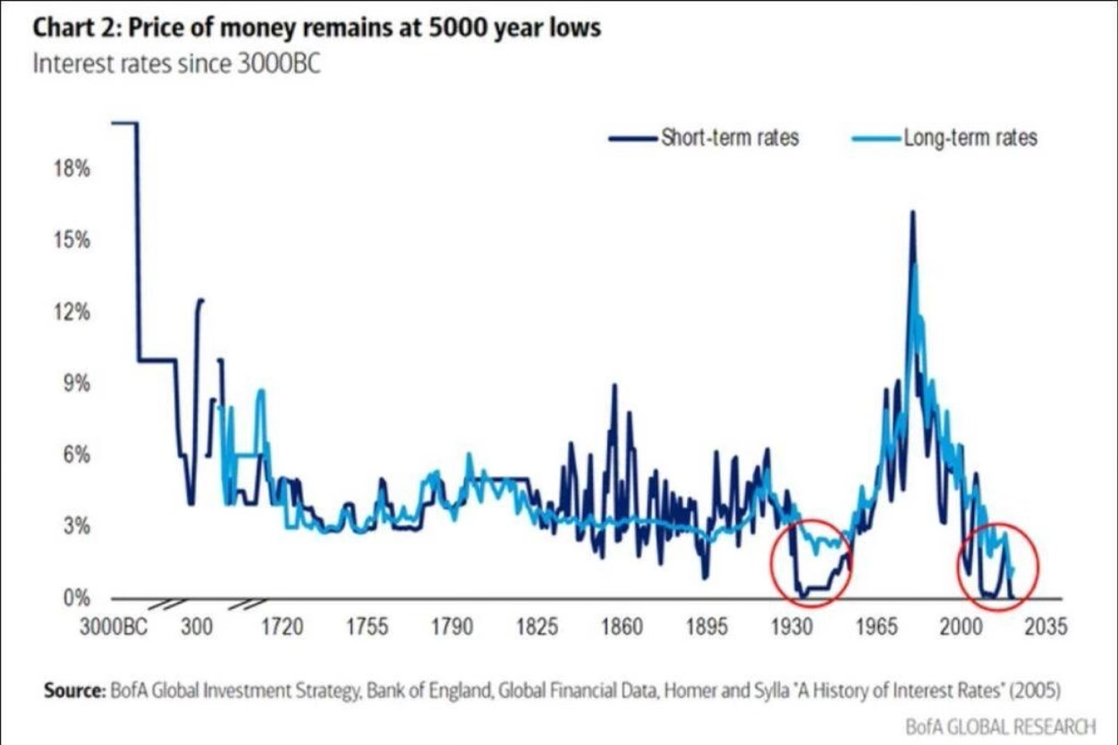 A long term view on the price of money indicated by the U.S. 10 year treasury bond. This is considered (by modern finance) as the ‘risk free rate’ of return. ‘Risk Free’ because the bond is backed by the full faith and credit of the United States (issuer of the debt). All risk assets derive their prices off of this metric. It’s the measure of assets globally. It is the linch pin of the financial system.