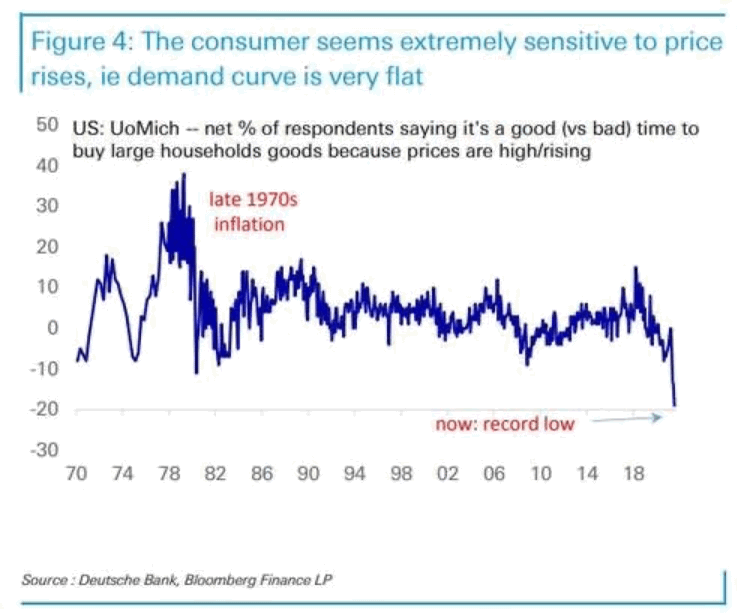 The appetite to consume more on the back of rising prices is at the weakest level in decades. Many are waiting for prices to come down before making large purchases assuming its a temporary (transitory) phenomenon. We shall see. This dynamic could reverse quickly if consumers belief that prices will continue to increase therefore destabilizing the ‘temporary’ narrative currently (2021) shared by the majority.