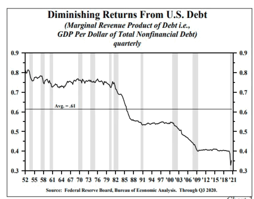 Each additional $1 of debt has an ever decreasing impact on economic growth, i.e., GDP (Gross Domestic Product)