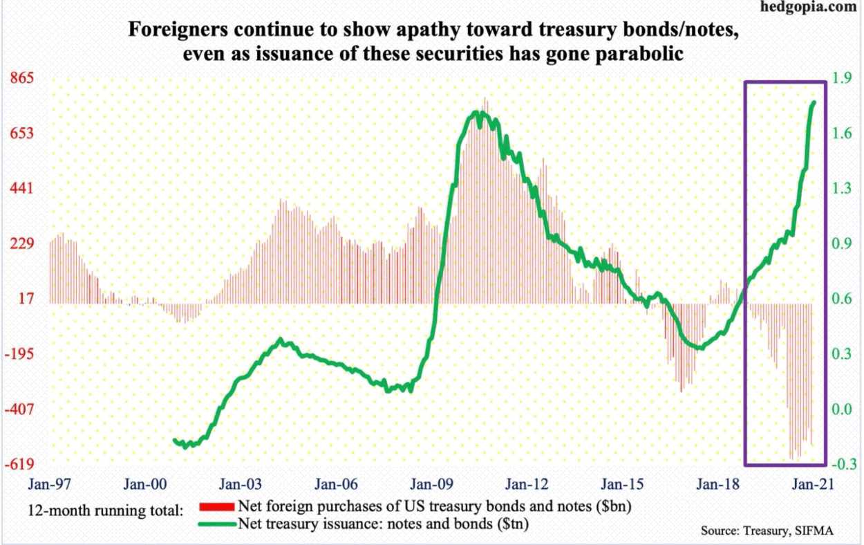 Net Treasury issuance (green line) started increasing again in 2016, however foreign investment in Treasuries didn’t follow suit. In fact, foreign governments have been net sellers during the last 5 years. This dynamic is new and seems to be gaining steam as foreigners have accellerated their liquidation of Treasuries. (Early stages of a US fiscal crisis brewing)