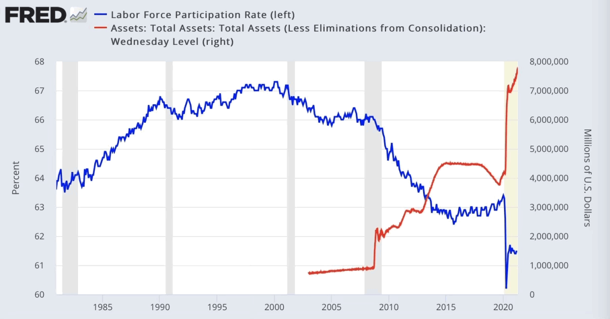 Total Assets is a measure of the Federal Reserves balance sheet of assets they’ve actively purchased and now hold… primarily made up of U.S. Treasury bonds and mortgage backed securities, i.e., housing bonds. The correlation to a weak labor force and Federal Reserve intervention is high. As the Fed continues to buy our government issued debt the broad economy appears to be weakened by this action from our central bank.
