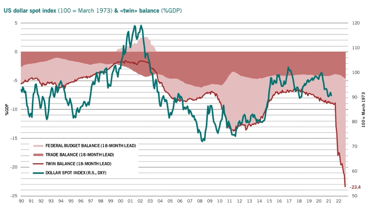 The red shaded area reflects ‘total’ national deficit spending per year since 1990. Dark red is annual trade and light red is the annual budget. The green line represents the value of the U.S. Dollar. The U.S. Dollar tends to follow either deficits or surpluses.