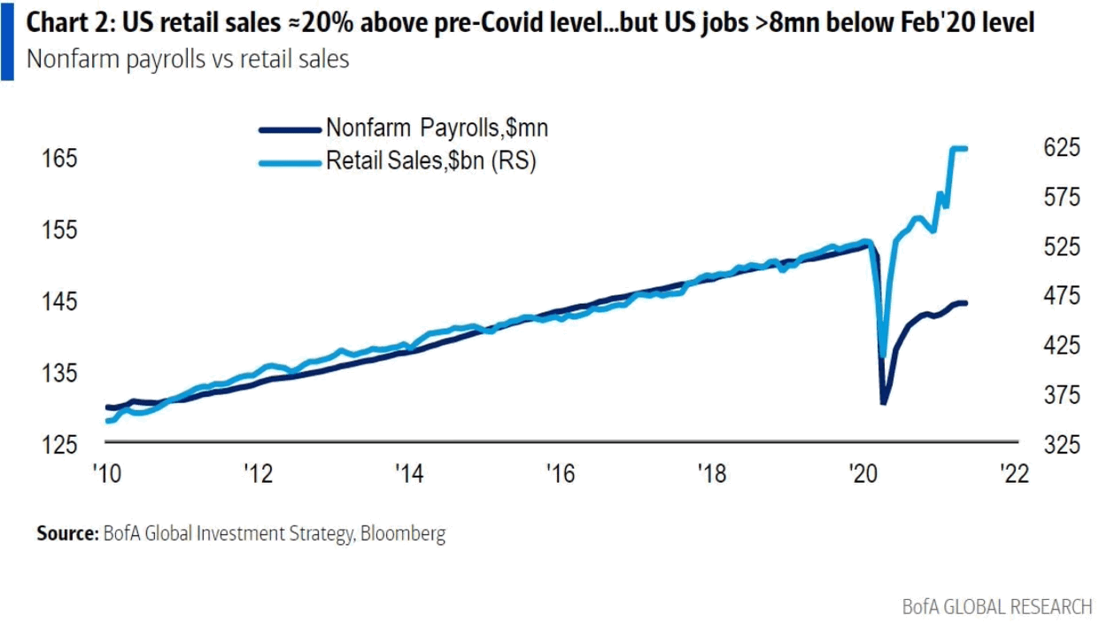 Retail sales reflect the confidence of the consumer and are highly correlated to employment. If the workforce is strong the people feel more able to consume. The pandemic has distorted this signal significantly. High retail sales but weak employment conditions. You can thank the policy response because of the pandemic for surging retail demand. Cash was dropped at an epic rate by government to the people so they could spend… and they did.